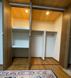 クローゼットの中には仕切り壁を作り、枕棚とハンガーポールを取り付けたので縦に広くなり、大容量のクローゼットになりました。